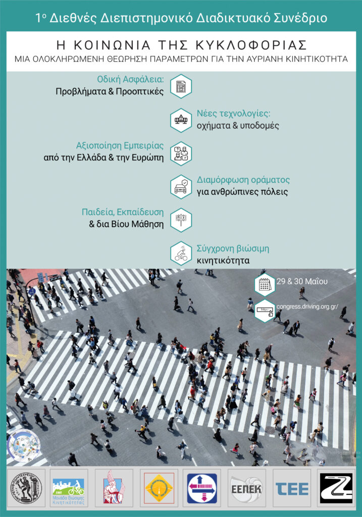 Στο πλαίσιο αυτό, σε συνεργασία με το Τεχνικό Επιμελητήριο Ελλάδας (ΤΕΕ), τη Μονάδα Βιώσιμης Κινητικότητας του Εθνικού Μετσόβιου Πολυτεχνείου (ΕΜΠ), Το Πολυτεχνείο Κρήτης (TUC), την Επιστημονική Ένωση για την Προώθηση της Εκπαιδευτικής Καινοτομίας (ΕΕΠΕΚ) και το Ινστιτούτο Βιώσιμης Κινητικότητας και Δικτύων Μεταφορών (Ι.ΜΕΤ.) διοργανώνει το 1ο Διαδικτυακό Διεθνές Διεπιστημονικό Συνέδριο Οδικής Ασφάλειας με θέμα: Η Κοινωνία της Κυκλοφορίας. Μια ολοκληρωμένη θεώρηση παραμέτρων για την αυριανή κινητικότητα