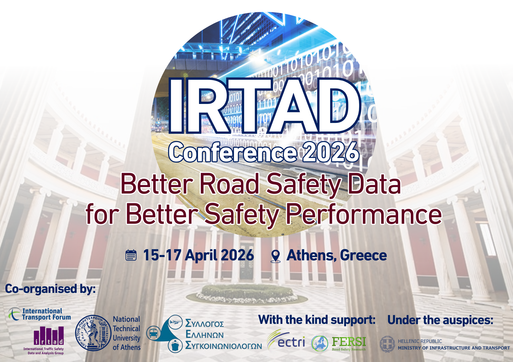 H Ομάδα Διεθνών Δεδομένων και Αναλύσεων Οδικής Ασφάλειας (IRTAD) του Διεθνούς Φόρουμ Μεταφορών (ITF/OECD), το Εργαστήριο Κυκλοφοριακής Τεχνικής του Εθνικού Μετσόβιου Πολυτεχνείου (ΕΜΠ) και ο Σύλλογος Ελλήνων Συγκοινωνιολόγων (ΣΕΣ) συνδιοργανώνουν το 8ο Διεθνές Συνέδριο IRTAD, με την υποστήριξη του FERSI και ECTRI, το οποίο θα διεξαχθεί στην Αθήνα στις 15-17 Απριλίου 2026, υπό την αιγίδα του Υπουργείου Υποδομών και Μεταφορών.