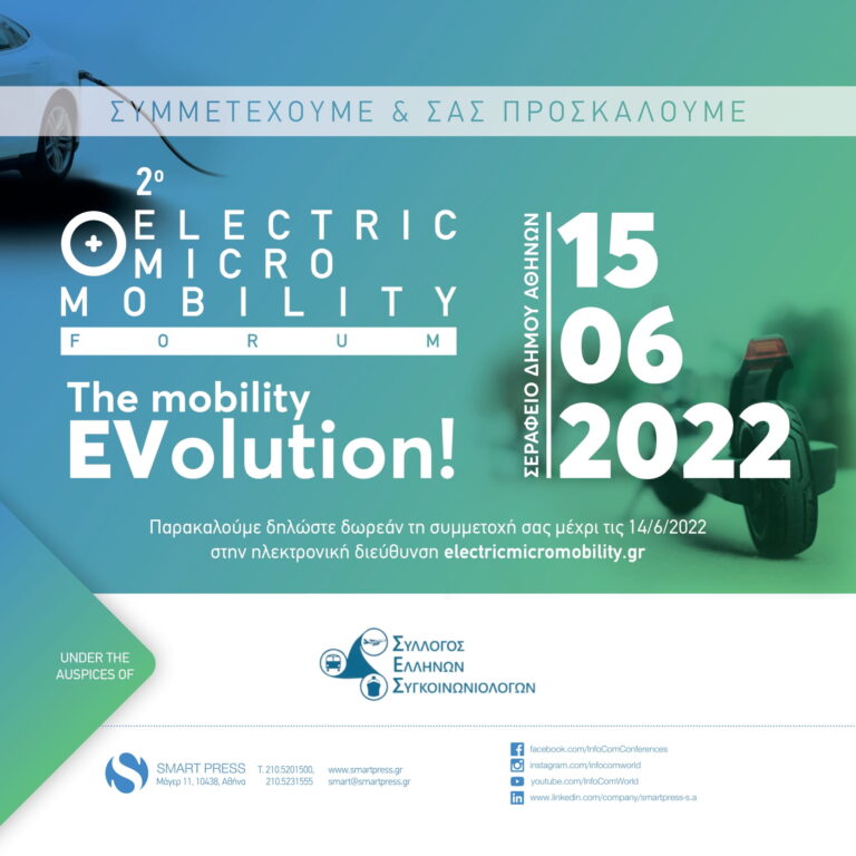 Η εταιρία Smart Press και το GetElectric.gr διοργανώνουν το 2ο “Electric & Micro Mobility Forum”, στις 15 Ιουνίου 2022, στο Σεράφειο Δήμου Αθηναίων (map), με σκοπό να εξερευνήσουν το μέλλον των Μεταφορών, οι οποίες μεταμορφώνονται χάρη στην ηλεκτροκίνηση και τη μικροκινητικότητα. Παράλληλα, το συνέδριο θα αναδείξει τους τρόπους με τους οποίους οι νέες τεχνολογίες Μεταφορών θα βελτιώσουν τις ζωές μας σε ατομικό και […]