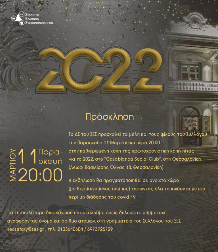 Το ΔΣ του ΣΕΣ διοργανώνει δια ζώσης εκδήλωση κοπής πίτας στη Θεσσαλονίκη την Παρασκευή 11 Μαρτίου, στο “Casablanca Social Club” (Λεωφ. Βασιλίσσης Όλγας 18, Θεσσαλονίκη). Η εκδήλωση θα πραγματοποιηθεί σε ανοιχτό χώρο (με θερμαινόμενες σόμπες) τηρώντας όλα τα ισχύοντα μέτρα περί μη διάδοσης του covid-19. Τιμή πρόσκλησης: 25 ευρώ Για την επιβεβαίωση τις εκδήλωσης και […]