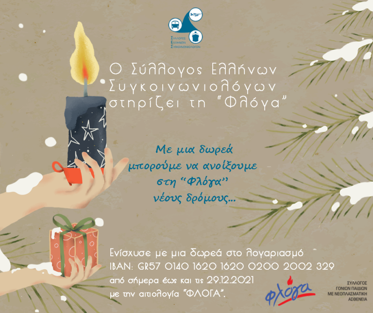 Το ΔΣ του ΣΕΣ στο πλαίσιο της κοινωνικής προσφοράς του Συλλόγου και ενόψει των φετινών Χριστουγέννων αποφάσισε να στηρίξει οικονομικά το Σύλλογο γονιών παιδιών με νεοπλασματική ασθένεια “Φλόγα”. Σε αυτό το πλαίσιο καλούμε μέλη και φίλους του Συλλόγου να πραγματοποιήσουν μια συμβολική κατάθεση χρηματικού ποσού για το Σύλλογο Φλόγα. Η κατάθεση θα πραγματοποιηθεί στο λογαριασμό […]