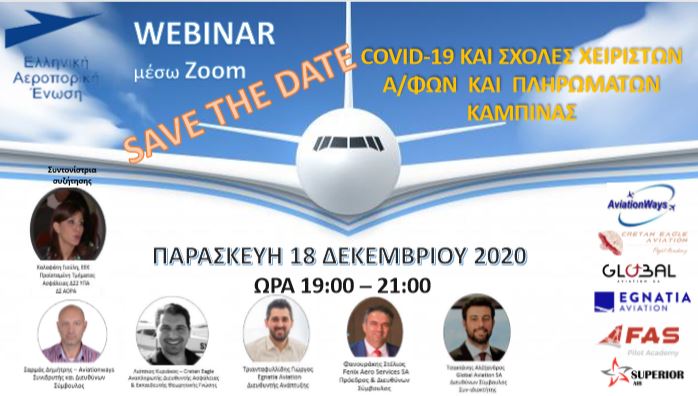 Η Ελληνική Αεροπορική Ένωση (www.aviationsociety.gr), διοργανώσει Webinar μέσω Zoom με θέμα, την αποτίμηση επιπτώσεων 10 μηνών πανδημίας στις Σχολές εκπαίδευσης Χειριστών και πληρωμάτων καμπίνας α/φων.