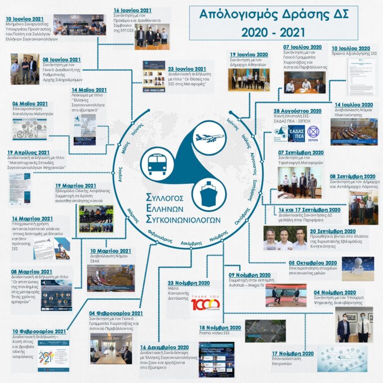 Με τη συμπλήρωση ενός έτους του νέου Διοικητικού Συμβουλίου, αναπτύχθηκε και παρατίθεται σχετικό γράφημα στο οποίο παρουσιάζονται συνοπτικά οι κυριότερες δράσεις του Συλλόγου Ελλήνων Συγκοινωνιολόγων το διάστημα Ιούνιος 2020-Μάιος 2021.