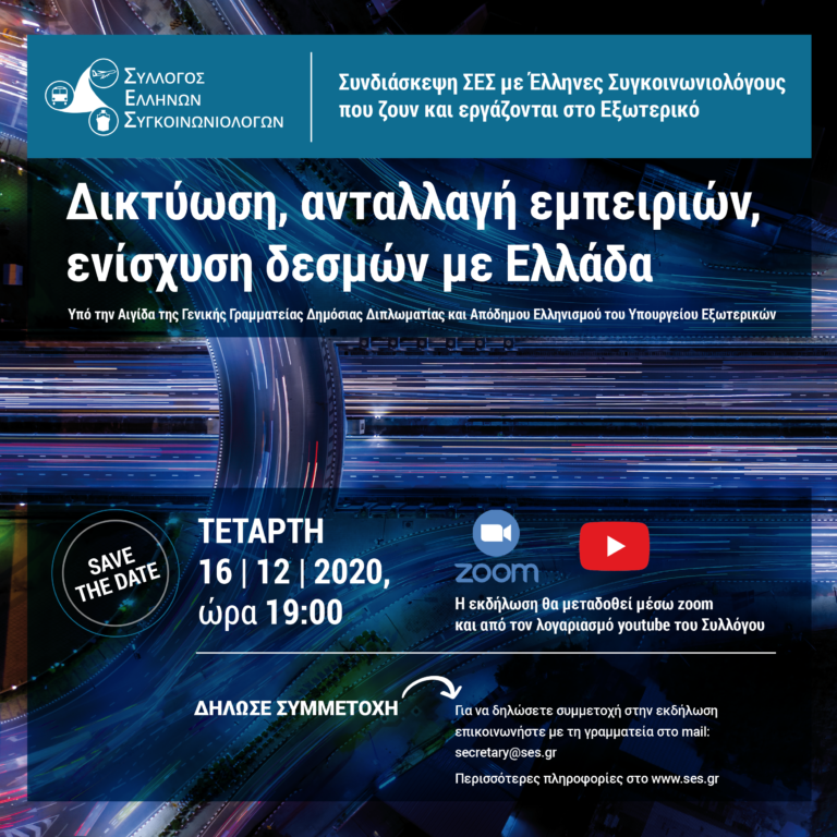 Η εκδήλωση είναι υπό την αιγίδα της Γενικής Γραμματείας Δημόσιας Διπλωματίας και Απόδημου Ελληνισμού του Υπουργείου Εξωτερικών και θα πραγματοποιηθεί την Τετάρτη 16 Δεκεμβρίου 2020 στις 19.00. Το θέμα της εκδήλωσης είναι «Συνδιάσκεψη ΣΕΣ με Έλληνες Συγκοινωνιολόγους που ζουν και εργάζονται στο Εξωτερικό - Δικτύωση, ανταλλαγή εμπειριών, ενίσχυση δεσμών με την Ελλάδα».