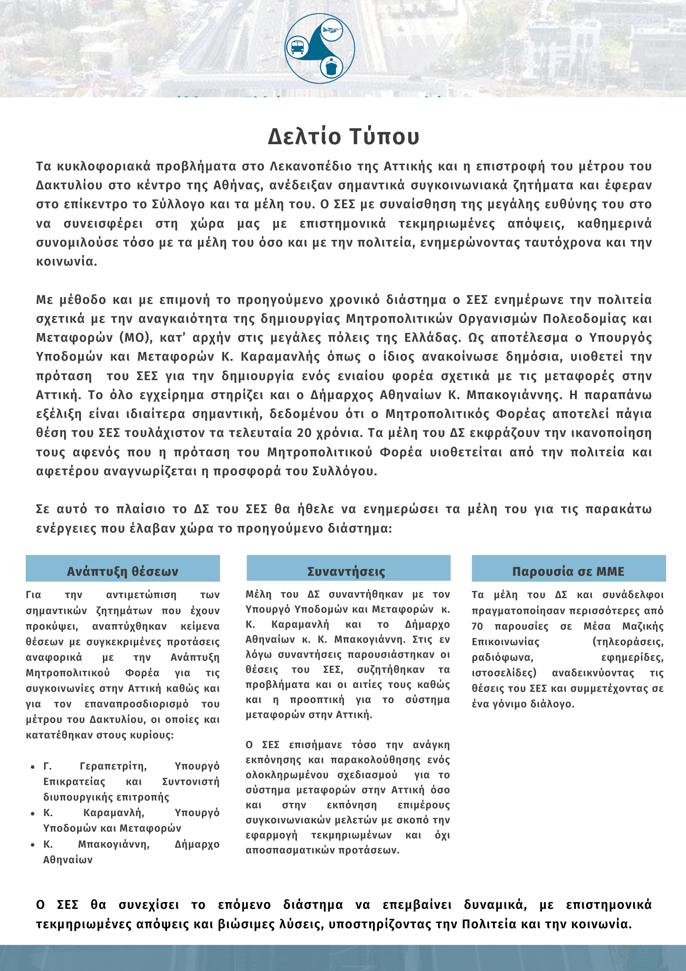 Με μέθοδο και με επιμονή το προηγούμενο χρονικό διάστημα ο ΣΕΣ ενημέρωνε την πολιτεία σχετικά με την αναγκαιότητα της δημιουργίας Μητροπολιτικών Οργανισμών Πολεοδομίας και Μεταφορών (ΜΟ), κατ’ αρχήν στις μεγάλες πόλεις της Ελλάδας. Ως αποτέλεσμα ο Υπουργός Υποδομών και Μεταφορών Κ. Καραμανλής όπως ο ίδιος ανακοίνωσε δημόσια, υιοθετεί την πρόταση του ΣΕΣ για την δημιουργία ενός ενιαίου φορέα σχετικά με τις μεταφορές στην Αττική. Το όλο εγχείρημα στηρίζει και ο Δήμαρχος Αθηναίων Κ. Μπακογιάννης. Η παραπάνω εξέλιξη είναι ιδιαίτερα σημαντική, δεδομένου ότι ο Μητροπολιτικός Φορέας αποτελεί πάγια θέση του ΣΕΣ τουλάχιστον τα τελευταία 20 χρόνια. Τα μέλη του ΔΣ εκφράζουν την ικανοποίηση τους αφενός που η πρόταση του Μητροπολιτικού Φορέα υιοθετείται από την πολιτεία και αφετέρου αναγνωρίζεται η προσφορά του Συλλόγου.