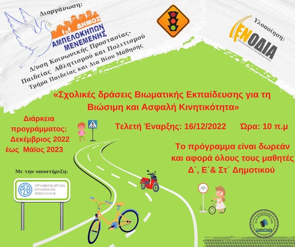 Στο πλαίσιο του επιχειρησιακού σχεδιασμού του Δήμου Αμπελοκήπων – Μενεμένης για την προώθηση και ενίσχυση της βιώσιμης και ασφαλούς κινητικότητας, το Τμήμα Παιδείας και Δια Βίου Μάθησης της Διεύθυνσης Κοινωνικής Προστασίας, Παιδείας, Αθλητισμού, Πολιτισμού διοργανώνει σε συνεργασία με τον μη κερδοσκοπικό οργανισμό ΕΝΟΔΙΑ, πρόγραμμα βιωματικής εκπαίδευσης για τη βιώσιμη και ασφαλή κινητικότητα των μαθητών/τριών Δημοτικών σχολείων του Δήμου.