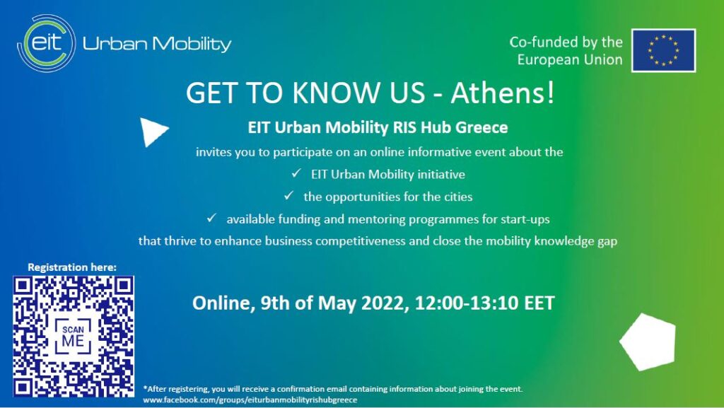 Την Δευτέρα 9 Μαϊου σας προσκαλεί να συμμετέχετε σε διαδικτυακή ενημερωτική δράση που στόχο έχει να μοιραστεί μαζί σας λεπτομέρειες σχετικά με την δράση του EIT Urban Mobility και των ευκαιριών που υπάρχουν για εσάς είτε εκπροσωπείται μία επιχείρηση, έναν φορέα τοπικής αυτοδιοίκησης ή έχετε ενδιαφέρον για τα θέματα της βιώσιμης κινητικότητας.