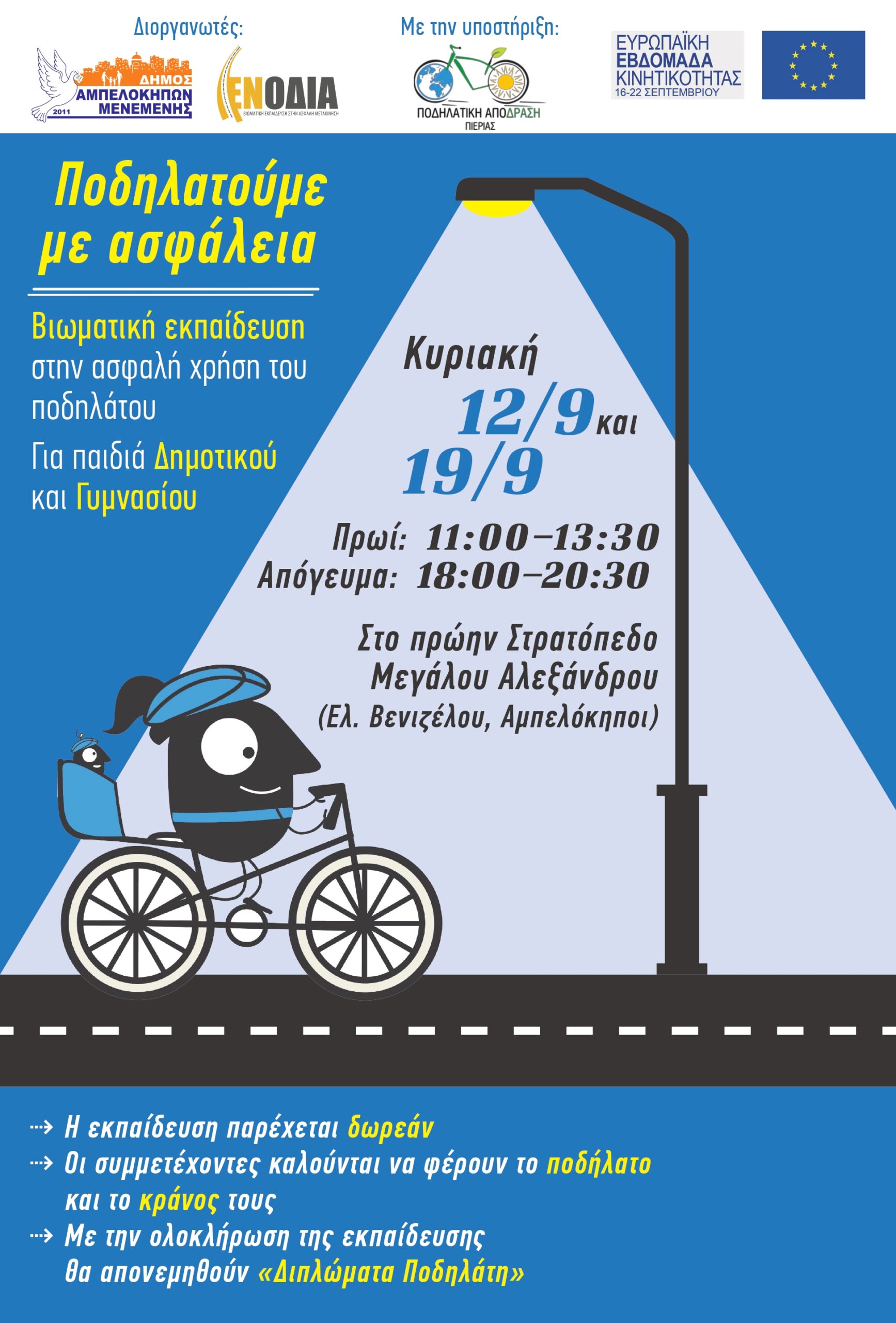 Την Κυριακή 12 Σεπτεμβρίου και την Κυριακή 19 Σεπτεμβρίου, η οργάνωση «ΕΝΟΔΙΑ – Βιωματική Εκπαίδευση στην Ασφαλή Μετακίνηση» με τους εθελοντές της και με τη συμμετοχή μελών του συλλόγου «Ποδηλατική Απόδραση Πιερίας», θα πραγματοποιήσει δράση εκπαίδευσης παιδιών ηλικιών δημοτικού και γυμνασίου στην ασφαλή χρήση του ποδηλάτου, στο πλαίσιο του προγράμματος του Δήμου Αμπελοκήπων – Μενεμένης για την Ευρωπαϊκή Εβδομάδα Κινητικότητας 2021.