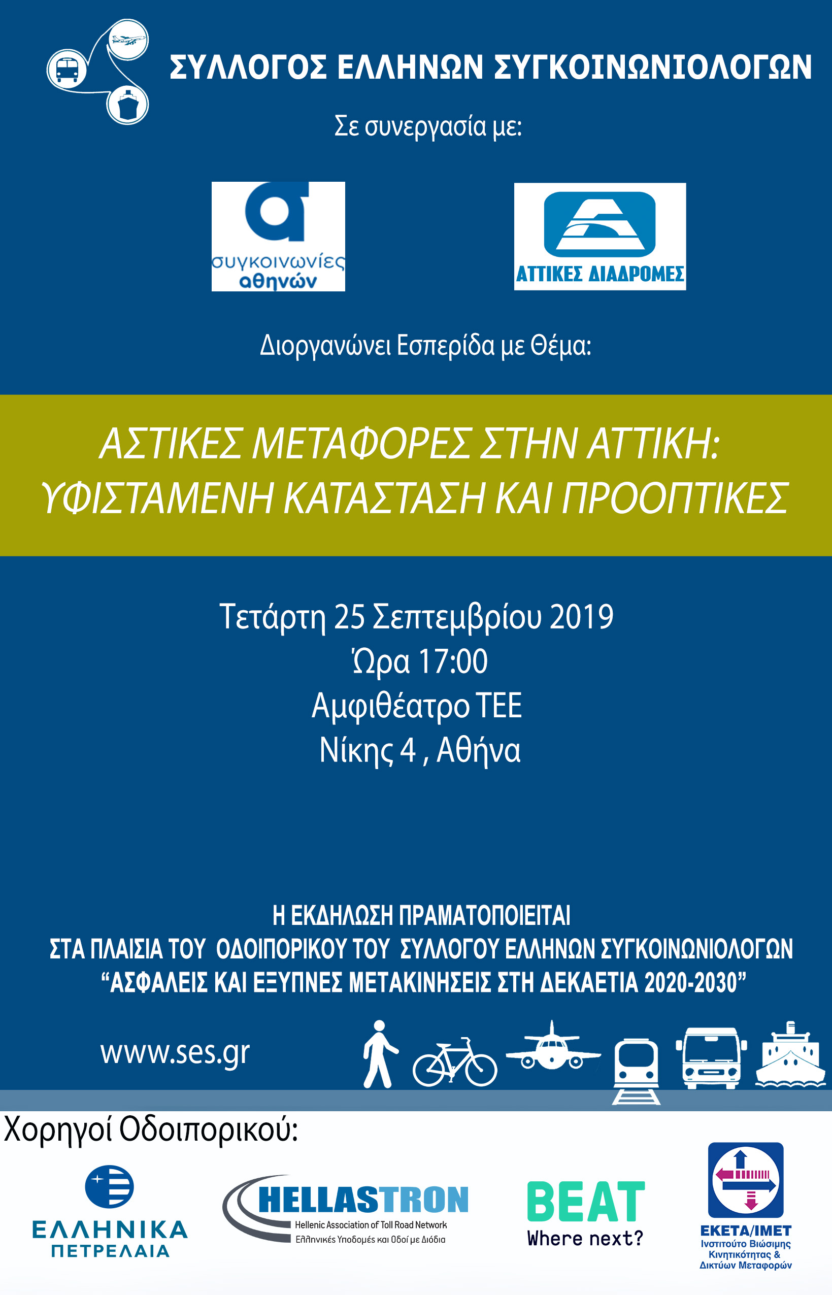 Στο πλαίσιο του Οδοιπορικού του ΣΕΣ «Ασφαλείς και Έξυπνες Μετακινήσεις στη Δεκαετία 2020-2030» διοργανώνεται εσπερίδα με τίτλο «Αστικές Μεταφορές στην Αττική: Υφιστάμενη κατάσταση και προοπτικές» σε συνεργασία με τον Ο.Α.Σ.Α. και τις Αττικές Διαδρομές Α.Ε. . Η ημερίδα θα πραγματοποιηθεί στις 25 Σεπτεμβρίου 2019, ώρα 17:00 και ημέρα Τετάρτη στο Αμφιθέατρο του Τεχνικού Επιμελητηρίου Ελλάδος (ΤΕΕ) Νίκης 4, Αθήνα.