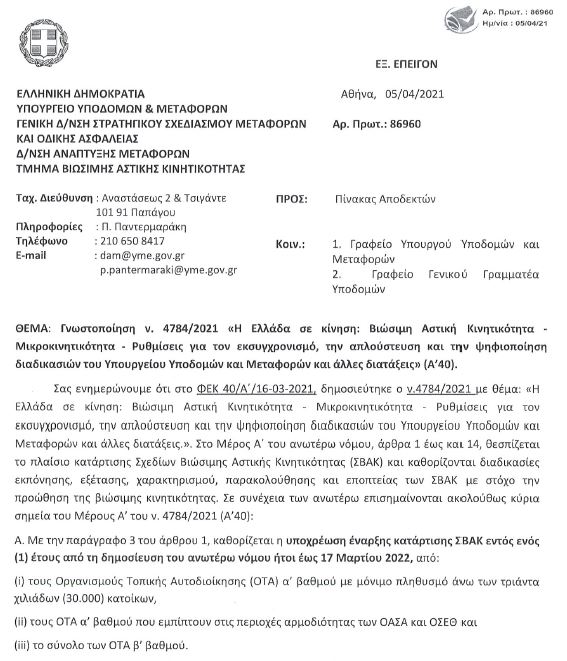 Διευκρινιστική επιστολή εστάλη από το Υπουργείο Υποδομών και Μεταφορών προς όλους τους αρμόδιους φορείς επισημαίνοντας ότι καταληκτική ημερομηνία για την έναρξη εκπόνησης ΣΒΑΚ τόσο για τους Δήμους με πληθυσμό άνω των 30.000 κατοίκων όσο και για τις Περιφέρειες είναι η 17η Μαρτίου 2022.