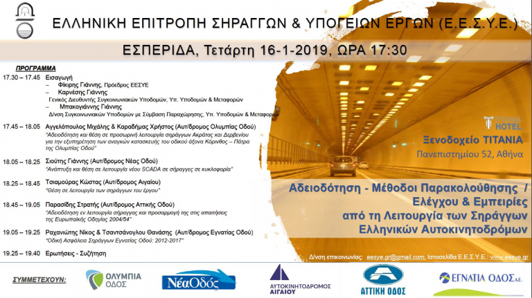 H Ελληνική Επιτροπή Σηράγγων και Υπογείων Έργων διοργανώνει εσπερίδα με τίτλο “Αδειοδότηση – Μέθοδοι Παρακολούθησης / Ελέγχου & Εμπειρίες Ελέγχου από τη Λειτουργία των Σηράγγων Ελληνικών Αυτοκινητοδρόμων” την Τετάρτη 16/1/2019 στο Ξενοδοχείο Τιτάνια στην Αθήνα. Διεύθυνση Επικοινωνίας: eesye.gr@gmail.com
