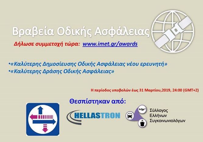 Τα βραβεία Οδικής Ασφάλειας θεσπίστηκαν το 2018 από το Σύλλογο Ελλήνων Συγκοινωνιολόγων (ΣΕΣ), τη HELLASTRON και το Ελληνικό Ινστιτούτο Βιώσιμης Κινητικότητας και Δικτύων Μεταφορών (IMET/ΕΚΕΤΑ) είναι δύο: το βραβείο “Καλύτερης Δημοσίευσης Οδικής Ασφάλειας νέου ερευνητή” που απευθύνεται σε φοιτητές, πτυχιούχους, μεταπτυχιακούς, διδακτορικούς ή μεταδιδακτορικούς ερευνητές. Νέος ερευνητής θεωρείται οποιοσδήποτε έχει ερευνητική δραστηριότητα έως και 10 χρόνια […]