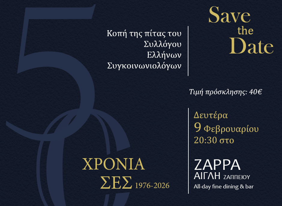 Το ΔΣ του ΣΕΣ προσκαλεί τα μέλη και τους φίλους του Συλλόγου τη Δευτέρα 9 Φεβρουαρίου και ώρα 20:30, στην καθιερωμένη κοπή της πρωτοχρονιάτικης πίτας για το 2026, στο Zappa στην Αίγλη Ζαππείου – Τιμή πρόσκλησης: 40€.