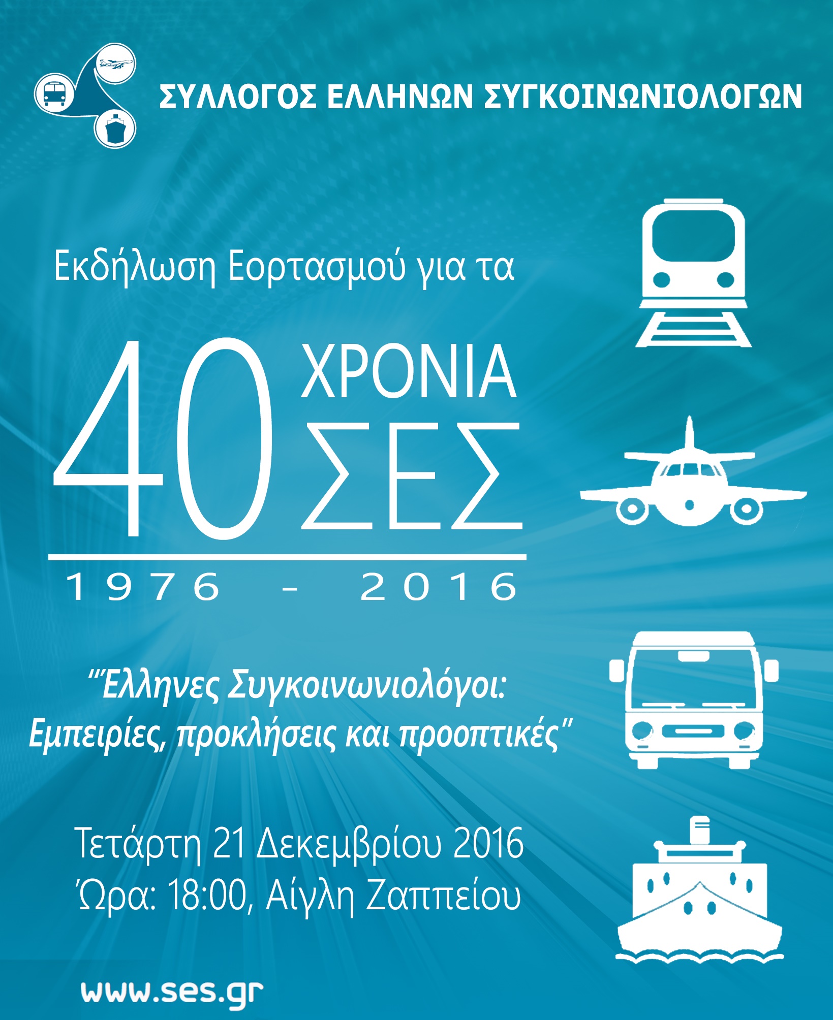 Ο Πρόεδρος και τα μέλη του Διοικητικού Συμβουλίου του Συλλόγου Ελλήνων Συγκοινωνιολόγων (ΣΕΣ) σας προσκαλούν την Τετάρτη 21 Δεκεμβρίου 2016, ώρα 18:00, σε εκδήλωση που θα πραγματοποιηθεί στην Αίγλη Ζαππείου στο πλαίσιο εορτασμού των 40 ετών ενεργής παρουσίας και δραστηριοποίησης του ΣΕΣ στον χώρο των Μεταφορών. Παρακαλούμε απαντήστε στην πρόσκληση ακολουθώντας τον παρακάτω σύνδεσμο (http://free-rsvp.com/RSVP/O/4755064358092), εφόσον γνωρίζετε ότι θα παρευρεθείτε στην εκδήλωση.