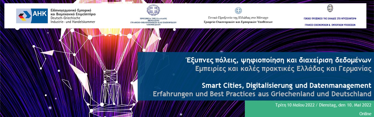 Tο Ελληνογερμανικό Εμπορικό και Βιομηχανικό Επιμελητήριο, το Γραφείο Οικονομικών και Εμπορικών Υποθέσεων (ΟΕΥ) της Ελληνικής Πρεσβείας Βερολίνου, το Γραφείο ΟΕΥ Μονάχου και το Γραφείο ΟΕΥ Ντύσσελντορφ σας προσκαλούν στην ψηφιακή ημερίδα με θέμα: «Έξυπνες πόλεις, ψηφιοποίηση και διαχείριση δεδομένων – Εμπειρίες και καλές πρακτικές Ελλάδας και Γερμανίας», που θα διεξαχθεί διαδικτυακά την Τρίτη 10 Μαΐου 2022 και ώρα 17:00.