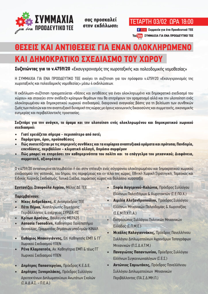 Ο Πρόεδρος του ΣΕΣ, Π. Παπαντωνίου, συμμετείχε στην εκδήλωση με θέμα «Θέσεις και αντιθέσεις για ένα ολοκληρωμένο και δημοκρατικό σχεδιασμό του χώρου» που πραγματοποιήθηκε διαδικτυακά την Τετάρτη 3 Φεβρουαρίου 2021 από την παράταξη Συμμαχία για ένα προοδευτικό ΤΕΕ.