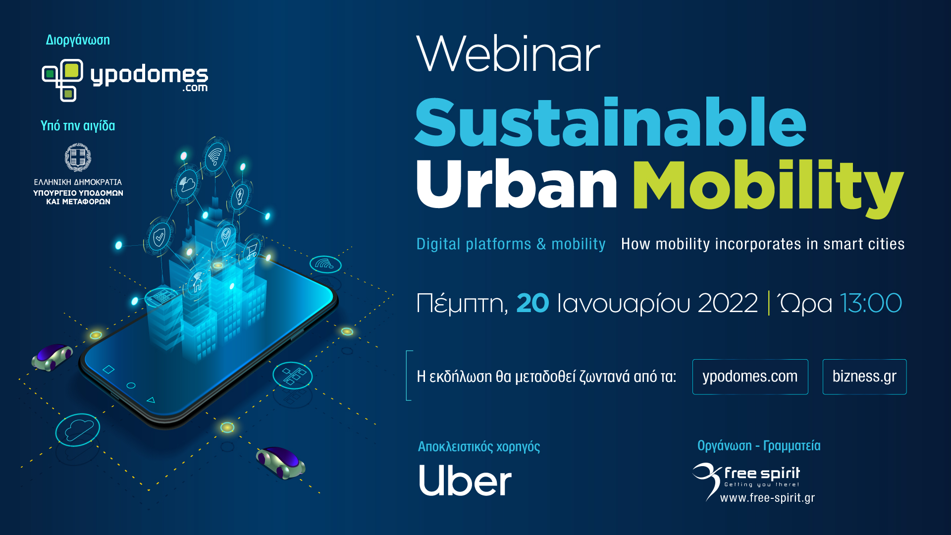 Στις 20 Ιανουαρίου 2022, το ypodomes.com διοργανώνει webinar που τελεί υπό την αιγίδα του υπουργείου Υποδομών και Μεταφορών, με τίτλο Sustainable Urban Mobility, το οποίο έχει ως στόχο την ανάδειξη του ρόλου της κινητικότητας στις πόλεις.